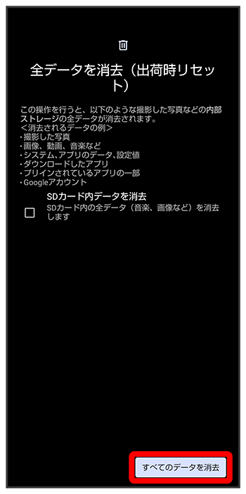 - 全データを消去(出荷時リセット)を行うと、内部ストレージのデータがすべて消去されます。必要なデータは事前にバックアップをとることをおすすめします。