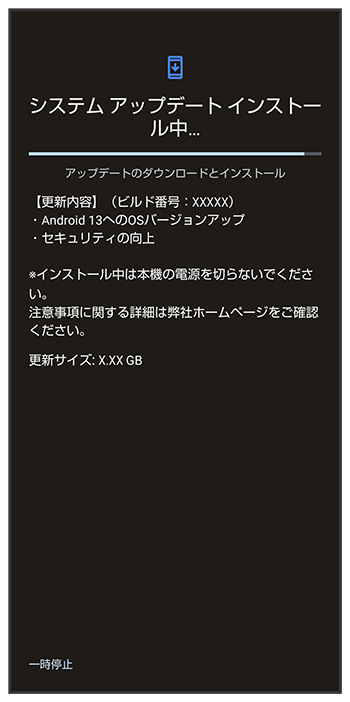 - システムアップデート中もほかの機能を使用できます。ただし、システムアップデートの通知後10日間は、システムアップデート中にほかの機能を使用していると、アップデートのインストールが一時的に停止されます。をタップすると、インストールが再開され、ほかの機能も使用可能になります。
