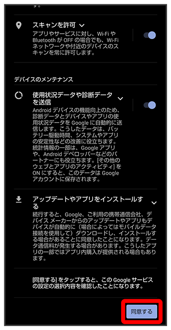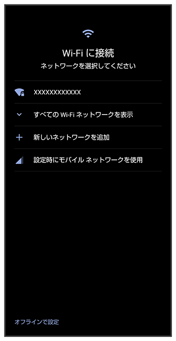 - モバイルネットワークを使用して初期設定を行うときは、を選択します。以降は、画面に従って操作してください。