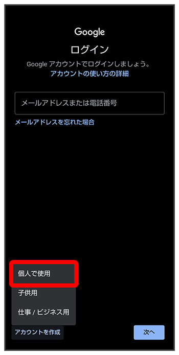 - 子供用のアカウントを作成する場合は、をタップし、画面に従って操作してください。