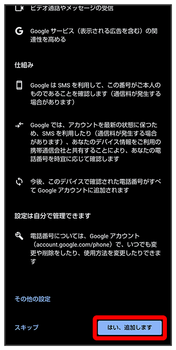 - セキュリティ保護目的でのみ電話番号を追加するときは、をタップします。以降は画面に従って操作してください。