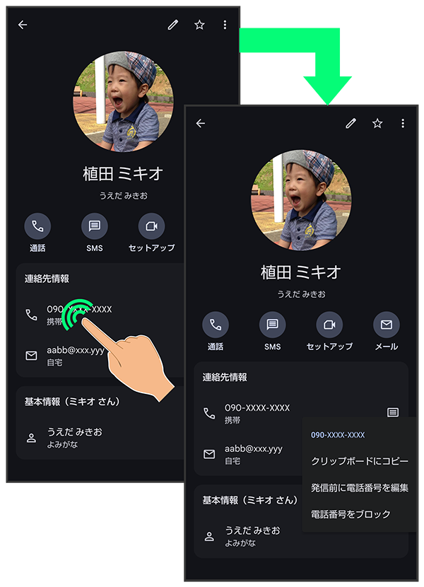 画面をロングタッチすると、利用できる設定や項目が表示される画面もあります。