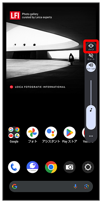 音量Upキー/音量Downキーを押して音量バーを表示させ、マナーモードが解除されます。