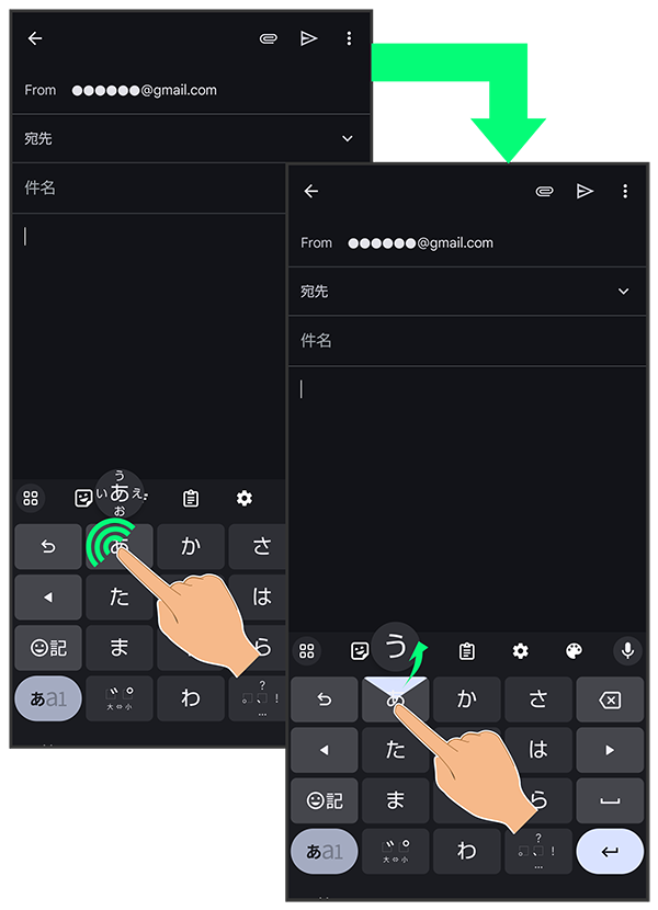 - キーをロングタッチすると、キー入力ガイドがポップアップで表示されます。キーをタップしたまま入力する文字の方向へフリックし、入力します。