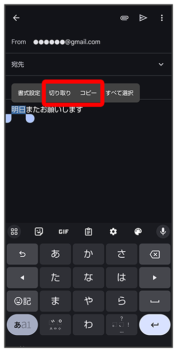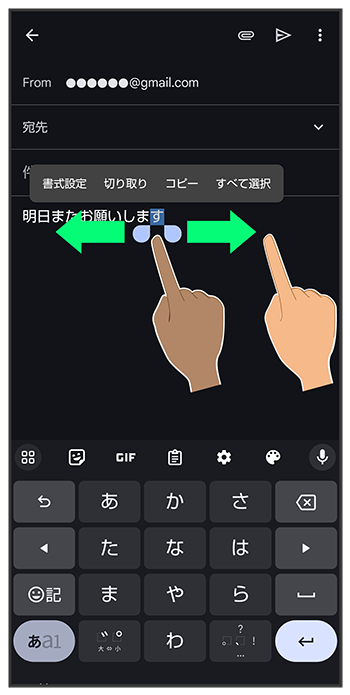 を左右にドラッグして、切り取り/コピーする文字を選択