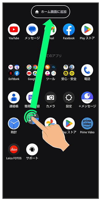 アプリ一覧画面でアプリをロングタッチし、「ホーム画面に追加」までドラッグ