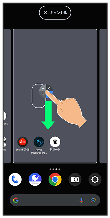 - 画面の端に表示されるシートまでドラッグすると、シートを切り替えて機能のショートカットを追加できます。一番右端のシートまでドラッグすると、シートを1枚増やして追加できます。