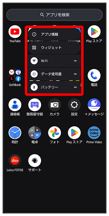 アプリをロングタッチすると、アプリにより機能へのショートカットが表示される場合があります。機能ショートカットをロングタッチし、ホーム画面の追加したい位置で指を離すと、機能へのショートカットとして追加することができます。