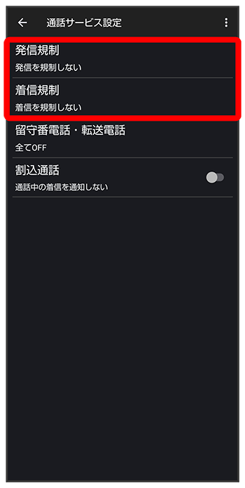 通話サービス設定画面で/規制方法をタップ発信規制をすべて解除する