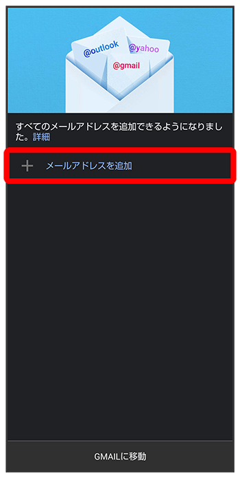(Gmail)を起動すると、アカウント設定画面が表示され、設定操作を行うことができます。
