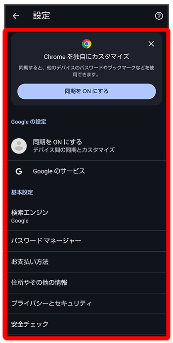 | 同期を ON にする | Google アカウントでログインして、ブックマークや履歴などの設定を利用できます。ログインすると、アカウント情報が表示されます。 |