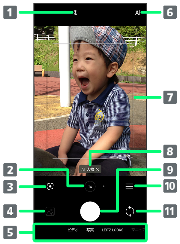 セルフタイマー、モバイルライト7の設定、ガイド線、AIモード1、ヒストグラム1のON/OFF切替、撮影時の各種設定を行います。撮影時の各種設定について詳しくは、「写真撮影の設定をする」、「写真/動画撮影共通の設定をする」を参照してください。 - イン/アウトカメラ切替8