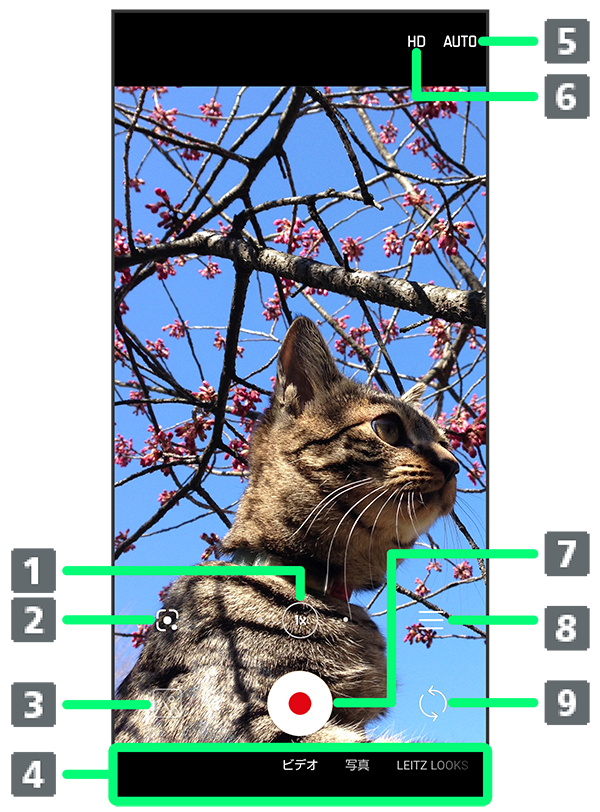 解像度、フレームレート、セルフタイマー、モバイルライトの設定、手ブレ補正のON/OFF切替、撮影時の各種設定を行います。撮影時の各種設定について詳しくは、「動画撮影の設定をする」、「写真/動画撮影共通の設定をする」を参照してください。 - イン/アウトカメラ切替4