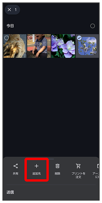 フォト画面で「アルバム」欄から写真/動画を追加したいアルバムをタップ追加したい写真/動画をタップ(- 写真/動画をタップするたびに、選択(