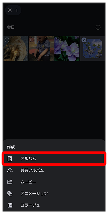 新規作成するアルバムの写真/動画をロングタッチ(