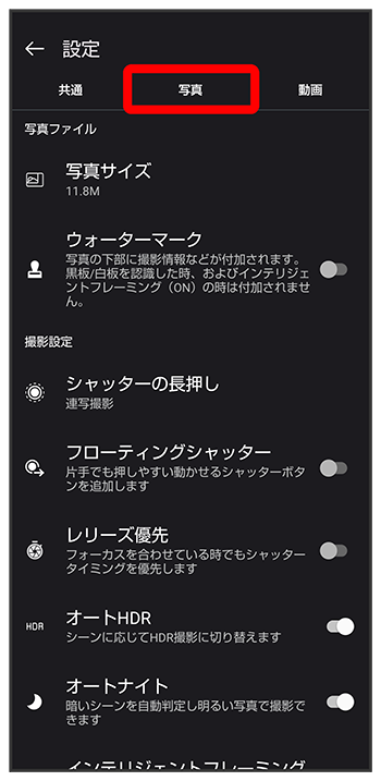 | オートHDR | 逆光などコントラストが強いシーンで、自動で白とび・黒つぶれを軽減して撮るかどうかを設定します。 |