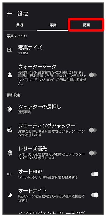 | AIライブシャッター | AIライブシャッターを利用するかどうかを設定します。 有効のときに動画を撮ると、AIが人物や犬、猫などを認識したり、構図を判断して、自動で写真を撮ります。 |