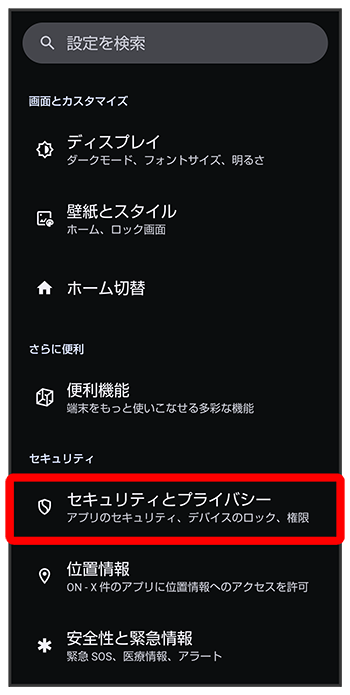 - 画面ロック解除方法の設定について詳しくは、「パターンを指でなぞって画面ロックを解除するように設定する」、「ロックNo.(PIN)で画面ロックを解除するように設定する」、「パスワードで画面ロックを解除するように設定する」を参照してください。