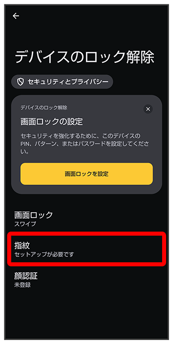 - 指紋認証ができないときの予備の画面ロック解除方法になります。