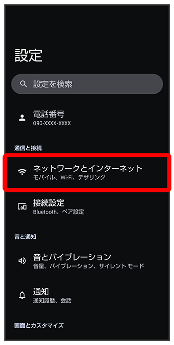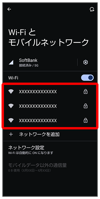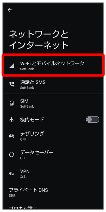 Wi-Fiとモバイルネットワーク画面が表示されます。