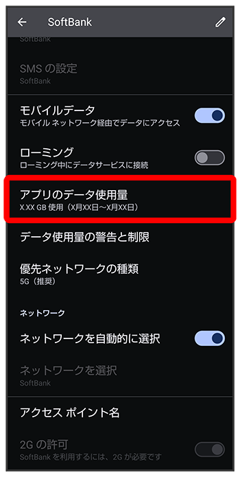 アプリのデータ使用量を確認する