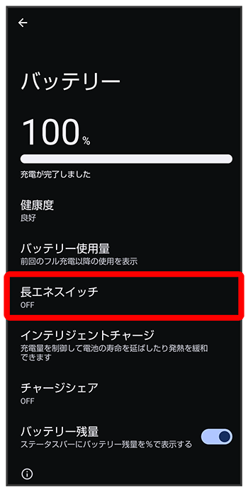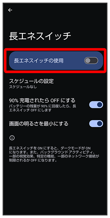 電池残量が90%になったときに長エネスイッチを自動的に無効にするかどうかを設定する