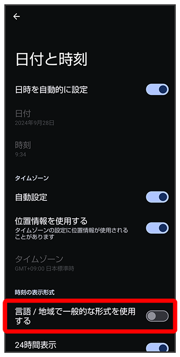 ユーザーの言語/地域の標準に従って24時間表示/12時間表示が自動設定されます。