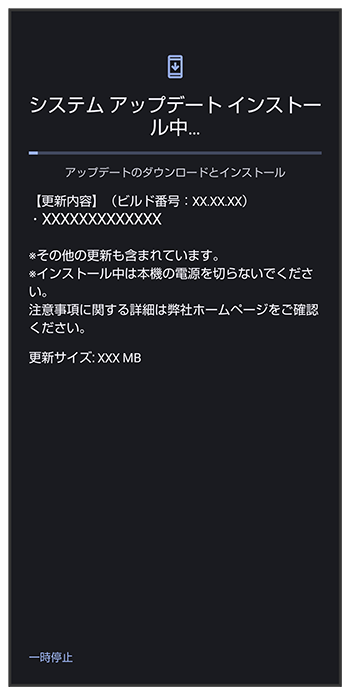 - システムアップデート中もほかの機能を使用できます。ただし、システムアップデートの通知後10日間は、システムアップデート中にほかの機能を使用していると、アップデートのインストールが一時的に停止されます。をタップすると、インストールが再開され、ほかの機能も使用可能になります。