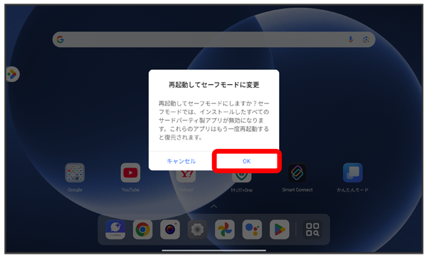• セーフモードで電源を入れると、画面左下に「セーフモード」と表示されます。