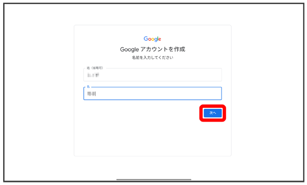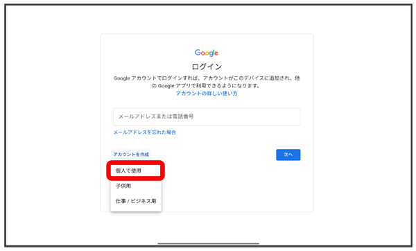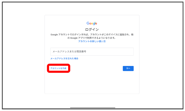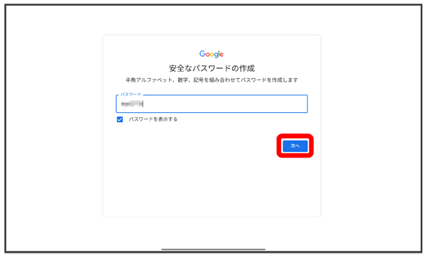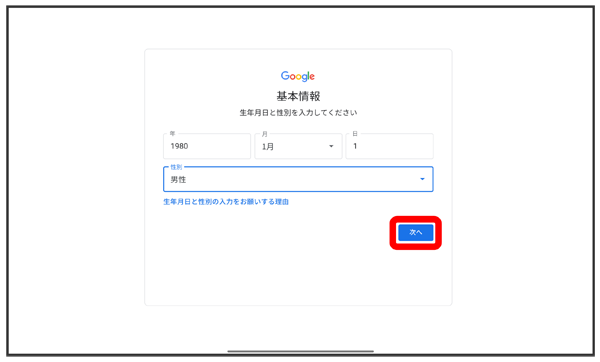 - 自分でGmail™ アドレスを作成する場合は、ユーザー名(メールアドレス)を入力と操作します。