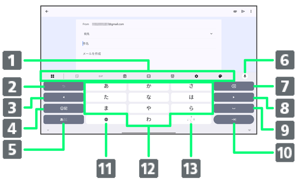 - 文字入力モードを切り替えます(ひらがな/半角英字/数字)。ロングタッチすると設定メニューが表示されます。