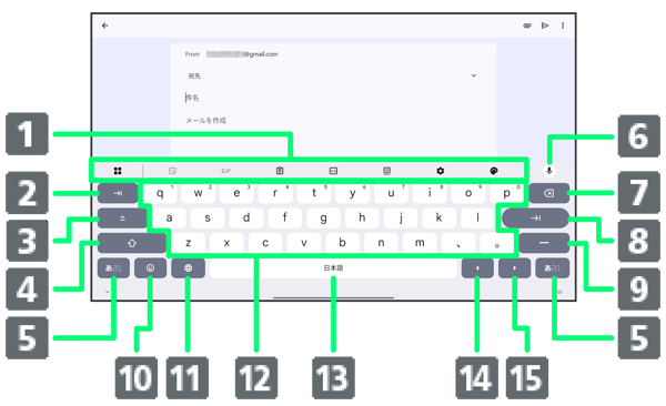 - キーボードを複数使用している場合に、ソフトウェアキーボードを切り替えます。ロングタッチしてもソフトウェアキーボードを選択できます。