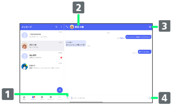 メッセージ画面で- メッセージ画面で、画面の右端から左へフリックしても一覧を表示できます。