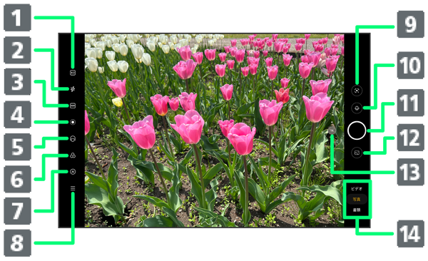 ズーム倍率を切り替えます。ドラッグすると細かくズーム倍率を切り替えられます。 - 撮影モード(ビデオ/写真/書類)の切り替え