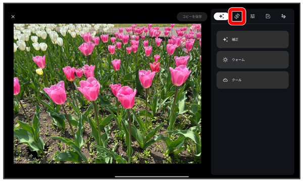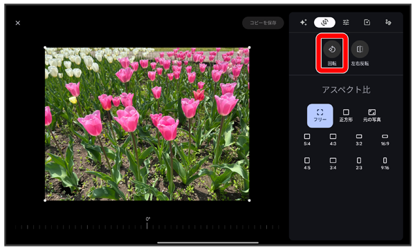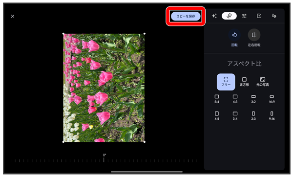 (回転)をタップするたびに写真が回転します。- 画面下部の目盛りを左右にドラッグして、傾き調整を行うこともできます。