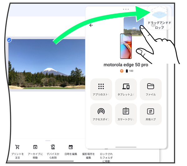 フォトなどのアプリでファイルをロングタッチ共有ハブのサムネイルにドラッグ