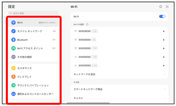 | Wi-Fi | Wi-Fiに関する設定ができます。 Wi-Fi接続の利用について詳しくは、「Wi-Fiで接続する」を参照してください。 |