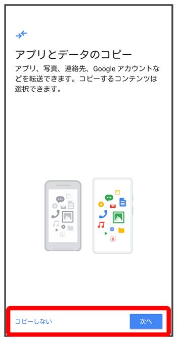 - Google アカウントを設定しているほかの端末からデータをコピーする場合は、をタップして、画面の指示に従って操作してください。