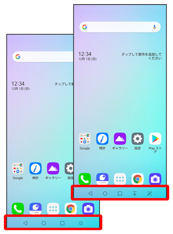 画面下部のアイコンが表示される領域を「ホームタッチボタン」と呼びます。アイコンをタップして操作できます。ホームタッチボタンは最大5つまで表示することができます。ホームタッチボタンをカスタマイズして、アプリのショートカットを追加したり、並び方を変更することができます。詳しくは、「表示の設定」を参照してください。