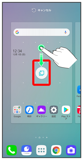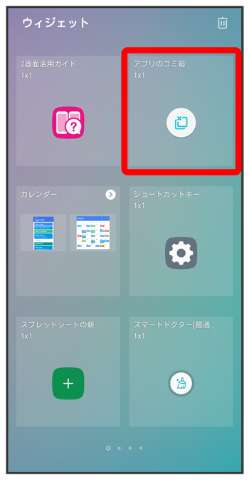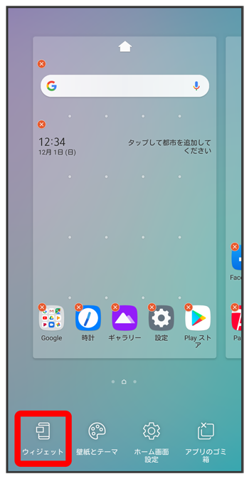 が表示されているウィジェットは、タップするとウィジェットの一覧が表示されます。一覧から追加したいウィジェットをロングタッチしてください。