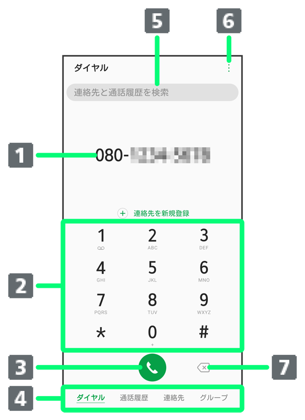 - 最後に入力した番号を削除します。ロングタッチすると、すべての番号を削除します。