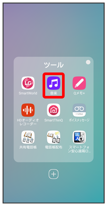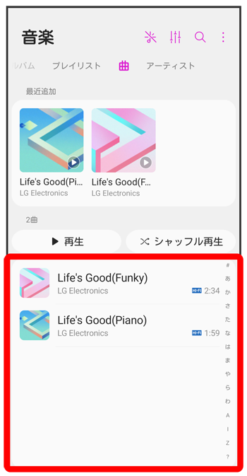 「フォルダー」/「アルバム」/「曲」/「アーティスト」タブをタップ曲名をタップ