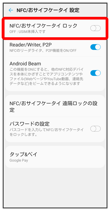 NFC/おサイフケータイ®設定画面で操作用暗証番号を入力(- が有効のときに設定できます。
