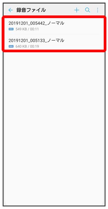 録音ファイル一覧画面で削除したい録音ファイルをロングタッチ