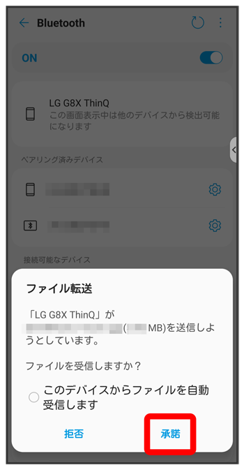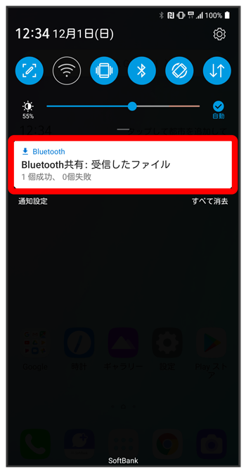 Bluetooth®機器からデータの受信要求があると、画面に通知が表示されます。次の操作を行うと、受信することができます。