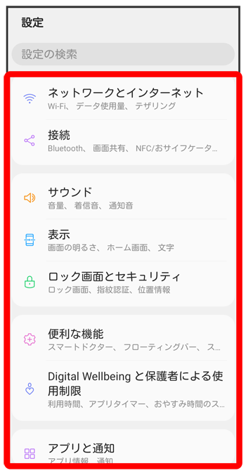 | ネットワークとインターネット | Wi-Fiやモバイルネットワーク、データ使用量など、ネットワークやインターネットに関する設定ができます。 |