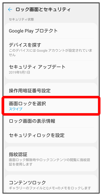ロック画面とセキュリティの設定画面が表示されます。