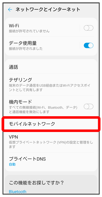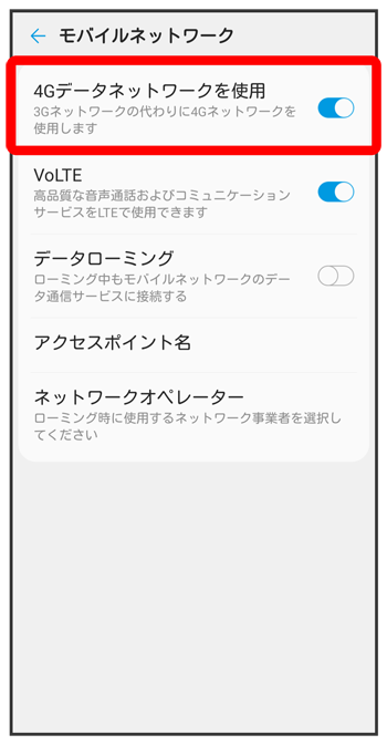 表示)に設定してください。4Gを利用しない場合はOFF(