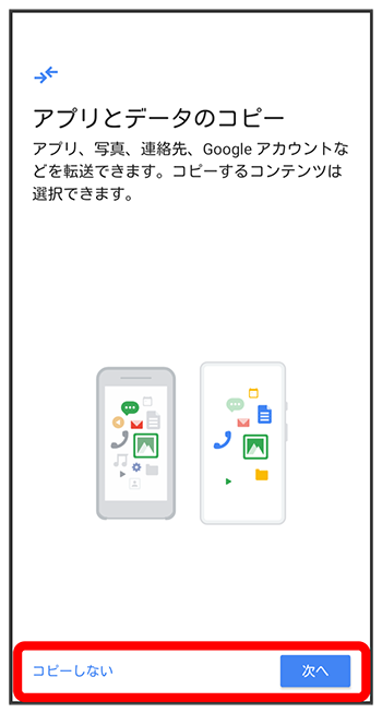 - Google アカウントを設定しているほかの端末からデータをコピーする場合は、をタップして、画面の指示に従って操作してください。