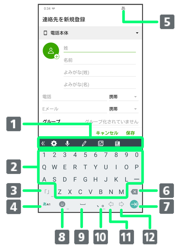 - 入力する文字種を切り替えます(ひらがな漢字/英字/数字)。